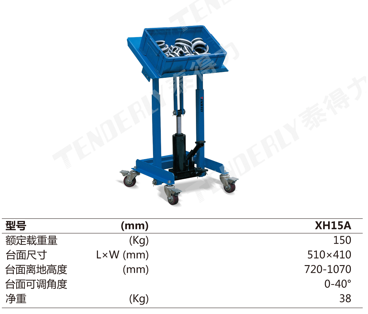 ● 人体工学设计,双立柱支撑结构;配置4个带刹车的万向PU轮,移动灵活 ● 台面高度液压起升,无论重载还是空载均可上升或下降 ● 台面可以在0-40°四孔位手动倾斜,高效省力 ● 广泛应用于装配工位、维修车间等工作场所