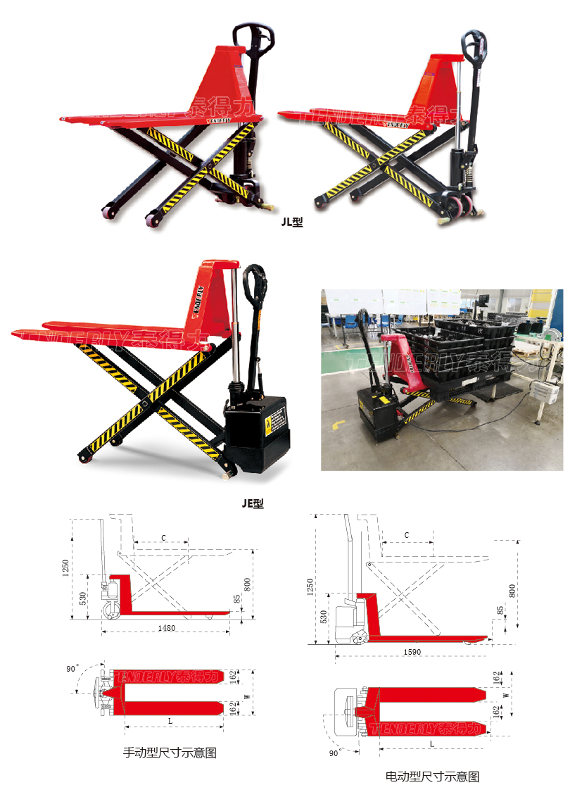 ● JL型为手动液压型,当升起高度大于420±mm时,叉腿稳定地撑住地面,