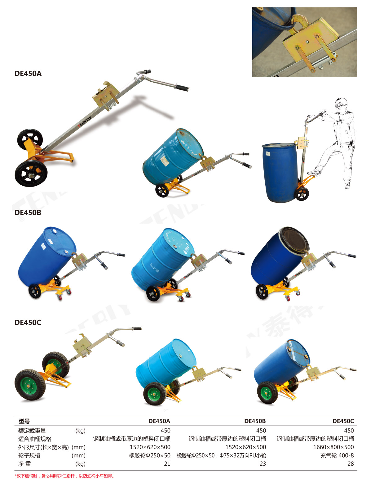 ● DE450C采用充气大轮,适用于工地或不平整的地面搬运油桶