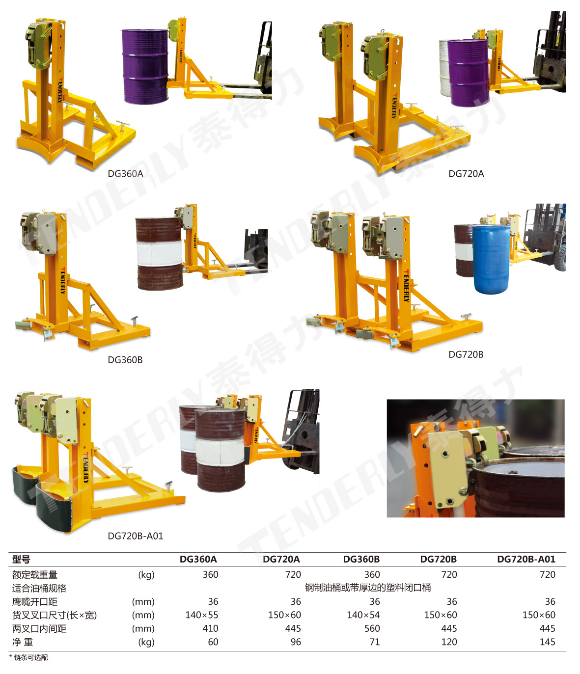 ● DG360B、DG720B、DG720B-A01采用独特的柔性双鹰嘴设计,抓取更牢固、更安全,并可有效地保护桶边